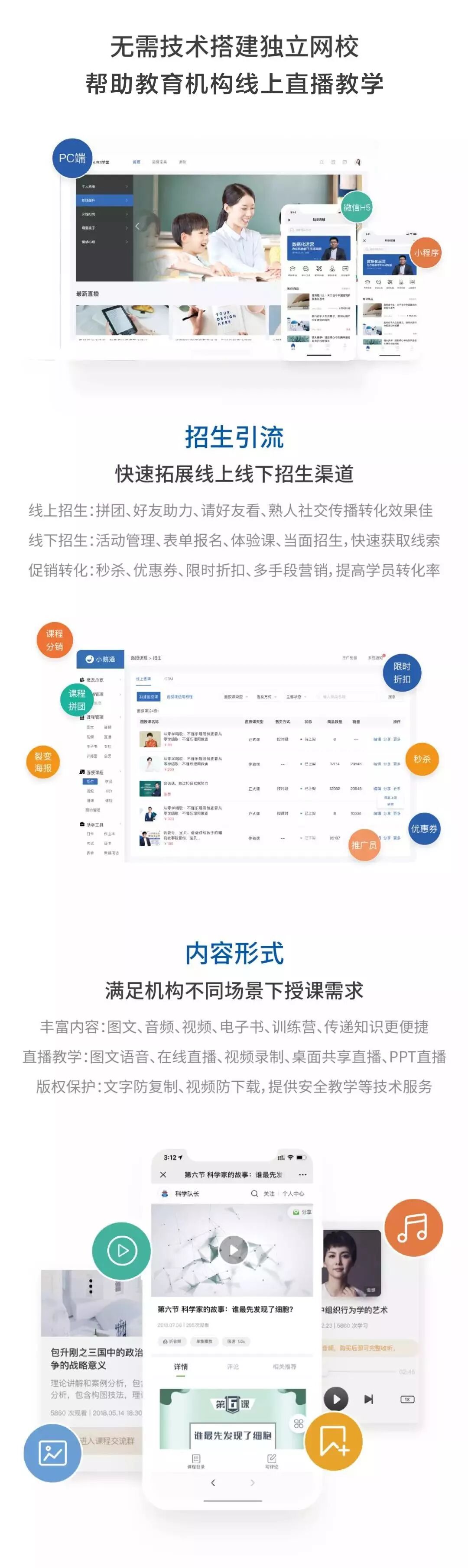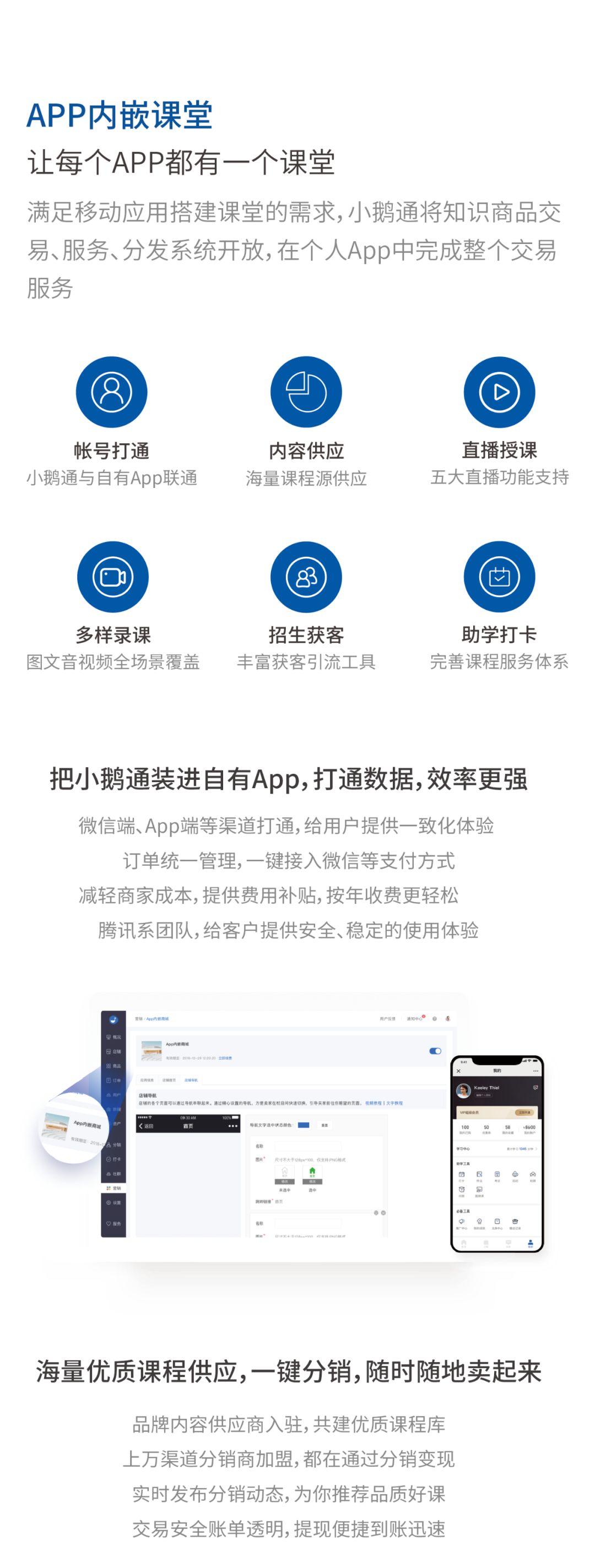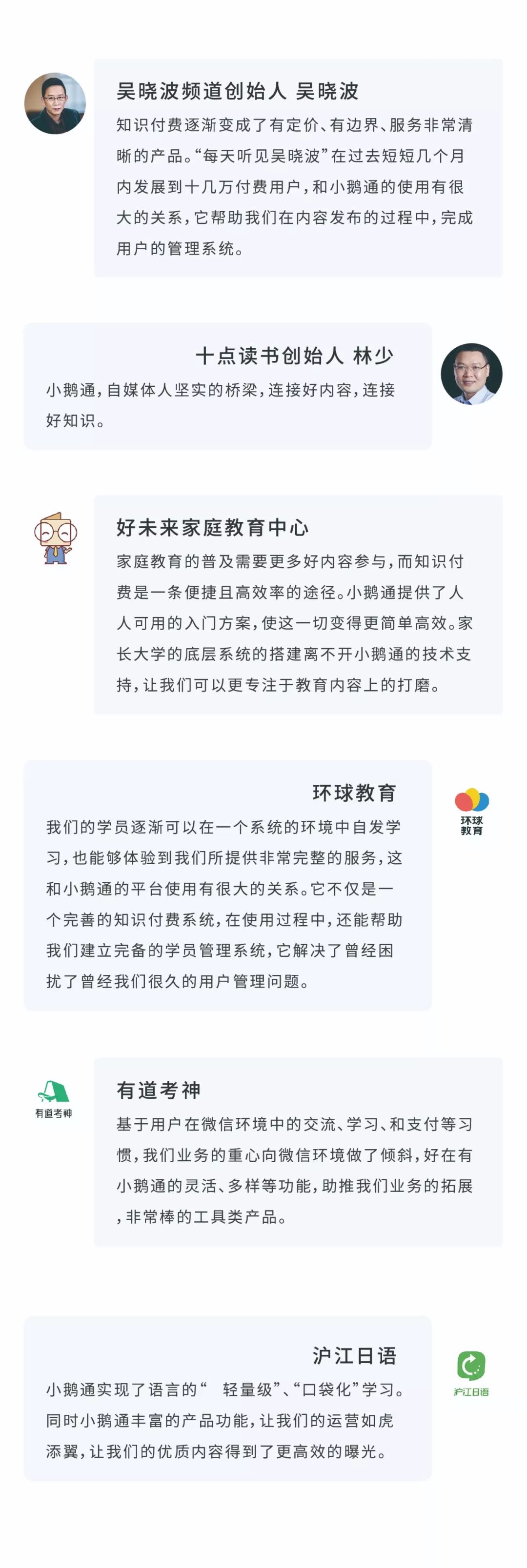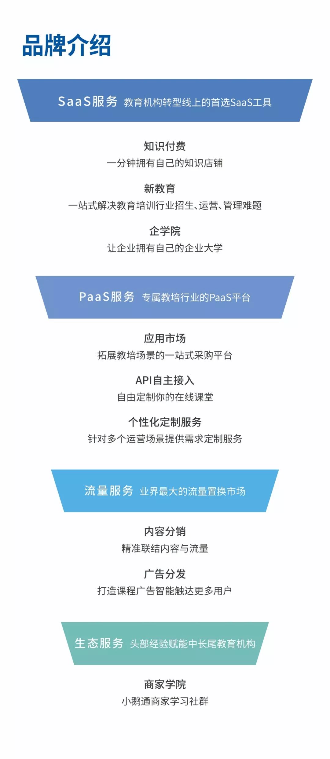 小鹅通是专注新教育的技术服务商。旗下产品包括:知识付费SaaS、新教育SaaS、企业内训、PaaS云服务、内容流量分发服务、商家学院、会务系统等,针对不同场景与行业,提供SaaS软件产品、分发、咨询等服务。