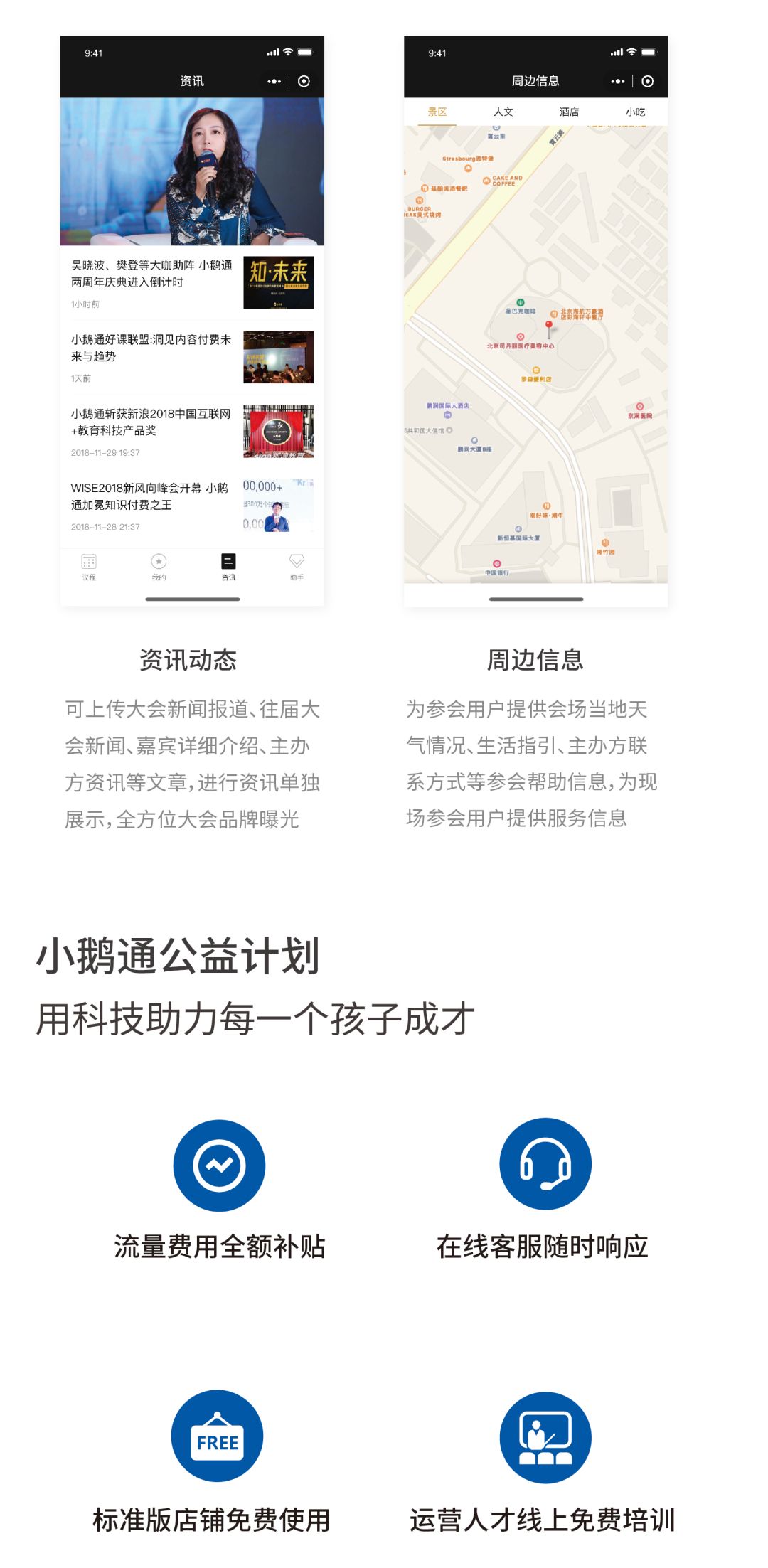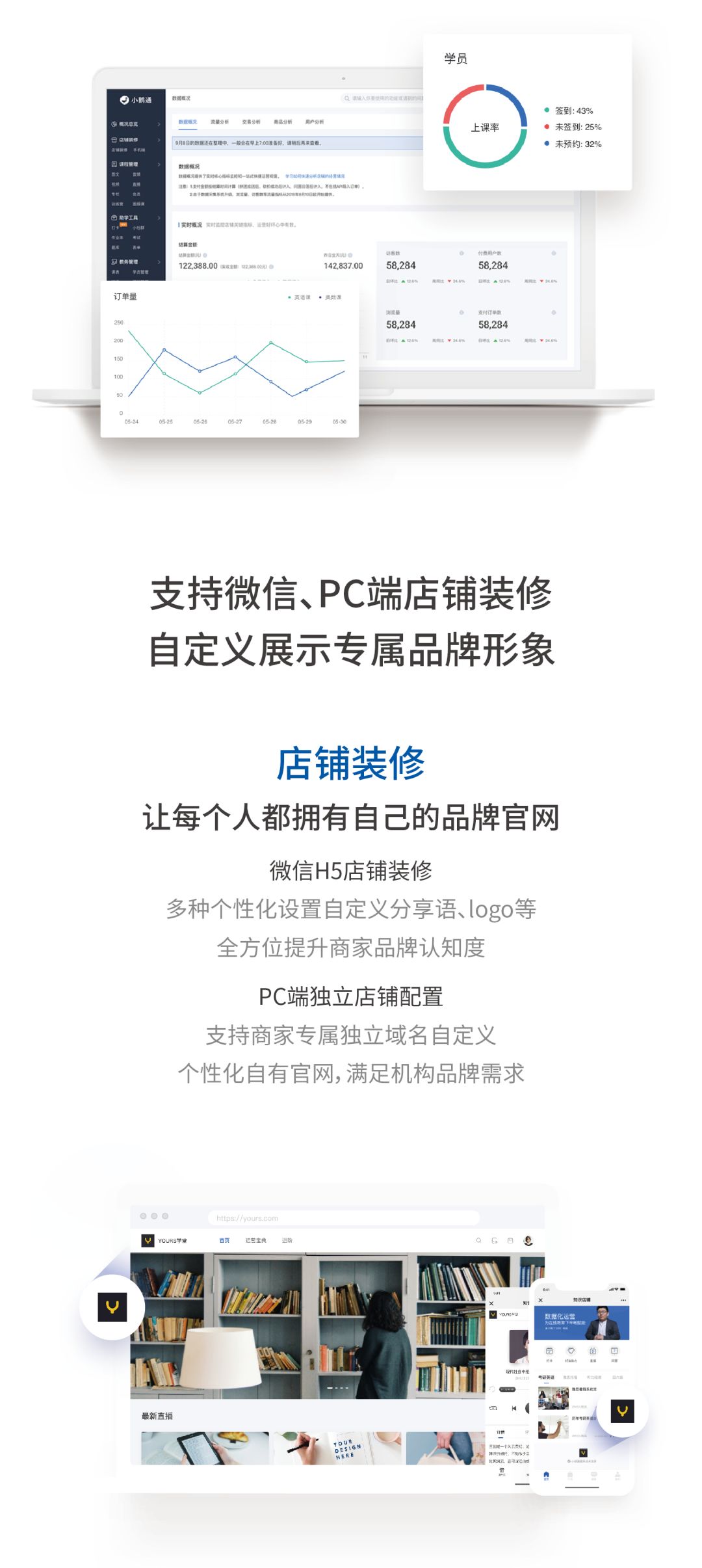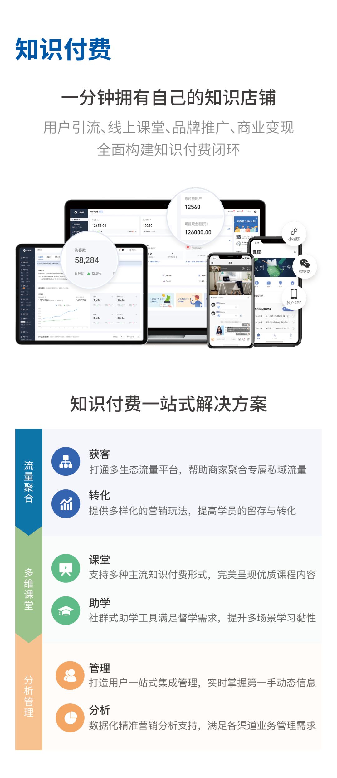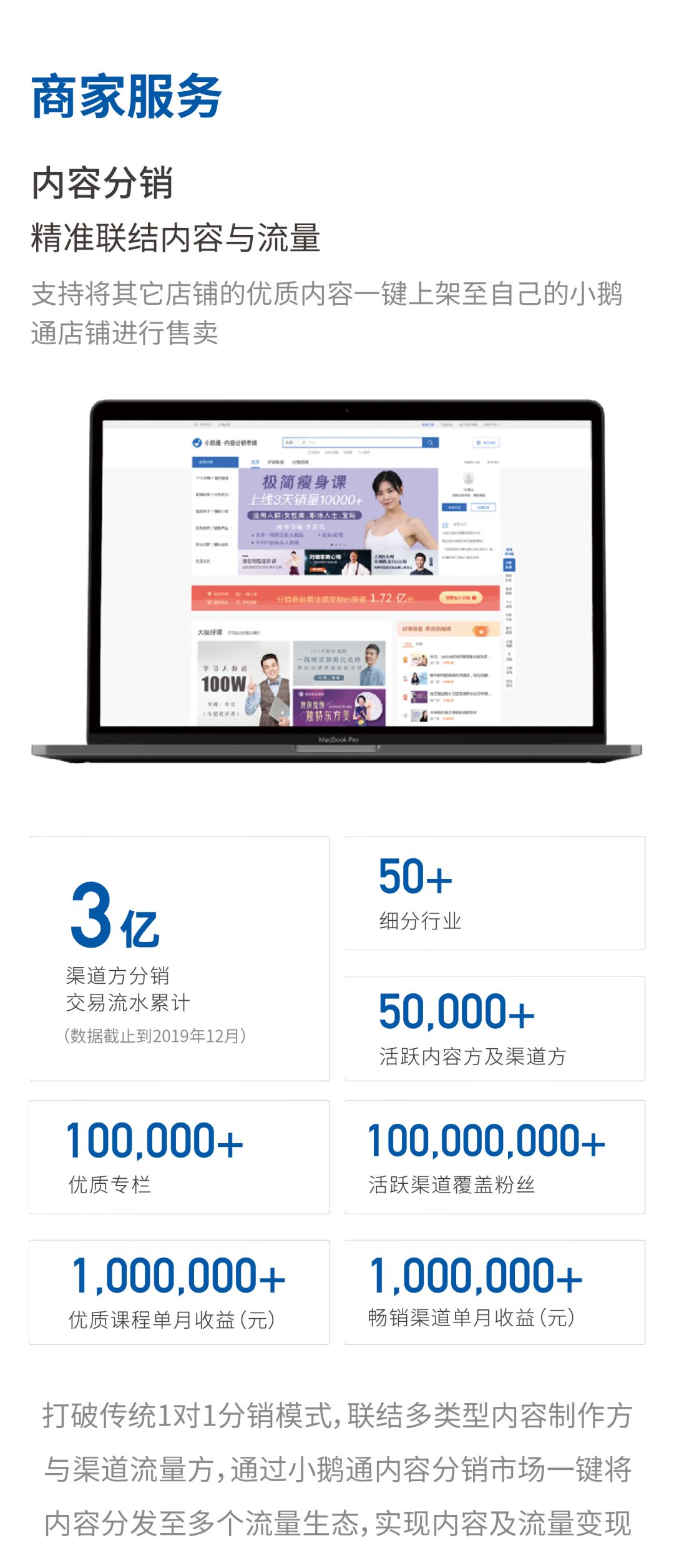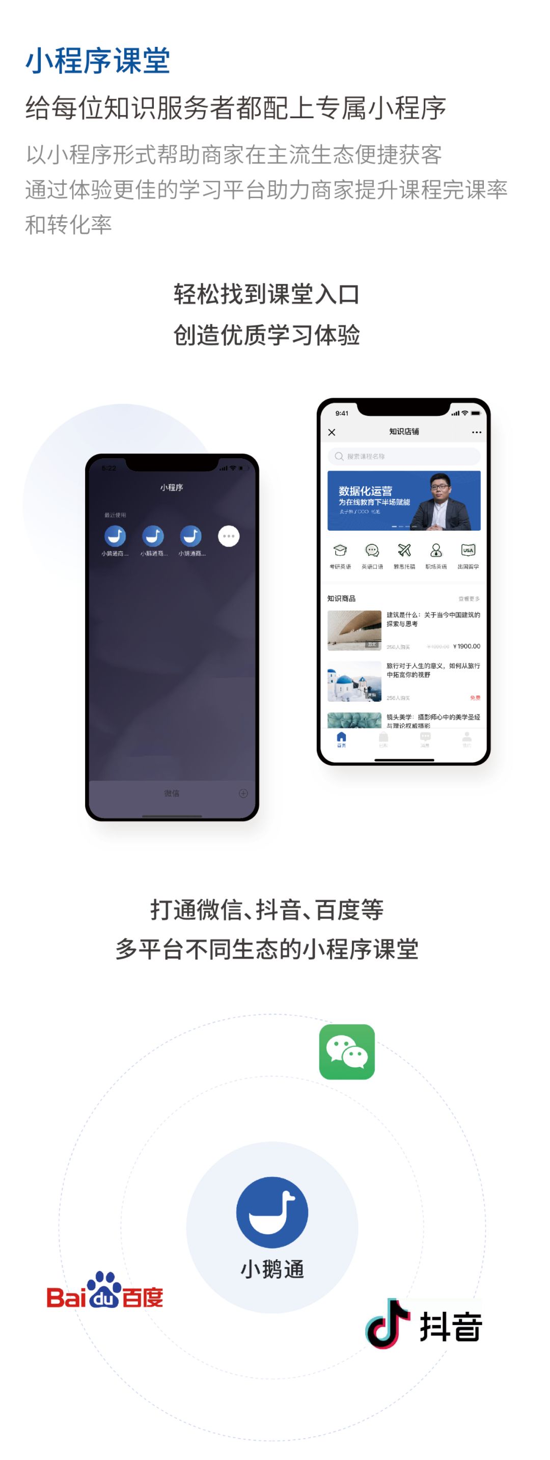 小鹅通致力于从工具、数据、流量、资源、人才等多方位,全面为内容创业者和教育培训机构提供从品牌传播到流量增长,课堂教学到学员运营,效率提升到商业变现的闭环式互联网解决方案。